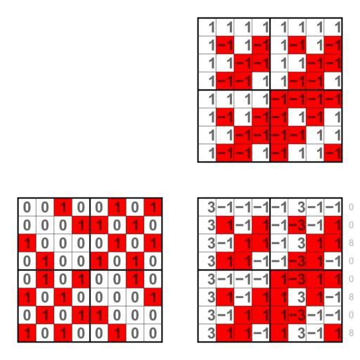 | Keywords: 0010 0101 Walsh spectrum.svg Walsh spectra of 3-ary Boolean functions like 0010 0101 The binary strings are multiplied with a Walsh matrix of order 8 The red squares in the background are additional information and show the product of the binary strings with a binary Walsh matrix own Lipedia Walsh spectrum of 3-ary Boolean functions |