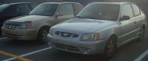 Keywords: '00-'02 & '03-'06 Hyundai Accent Hatchs.JPG 2000-2002 right 2003-2006 left Hyundai Accents photographed in Montreal Quebec Canada Own 2010-06-17 Bull-Doser Hyundai Accent LC