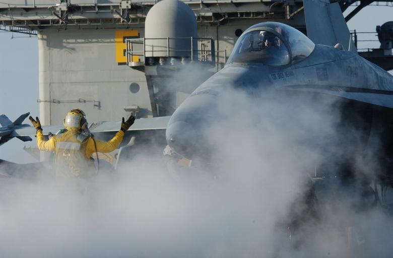 | Keywords: 011219-N-9769P-091 CVN 74 - Flight Deck Ops.jpg en 011219-N-9769P-091 At sea aboard USS John C Stennis CVN 74 Dec 19 2001- An Aviation Boatswain's Mate directs an F/A-18 Hornet from the Argonauts of Strike Fighter Squadron One Four Seven VFA-147 onto the catapult Stennis and her embarked Carrier Air Wing CVW 9 are deployed in support of Operation Enduring Freedom U S Navy photo by Photographer's Mate 3rd Class Jayme Pastoric RELEASED 011219-N-9769P-091 Navy http //www navy mil/view_image asp id 259 U S Navy photo by Photographer's Mate 3rd Class Jayme Pastoric PD-USGov-Military-Navy Aviation Boatswain's Mates Handlers Aboard USS John C Stennis CVN-74 F/A-18 Hornet on flight decks Strike Fighter Squadron 147 United States Navy |