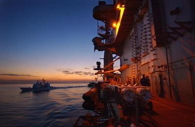| Keywords: 011222-N-2722F-131 USS Port Royal Underway.jpg en 011222-N-2722F-131 At sea aboard USS John C Stennis CVN 74 Dec 22 2001 - As the sun sets the guided-missile cruiser USS Port Royal CG 73 left pulls away from replenishment ship USNS Concord T-AFS 5 center John C Stennis and its carrier battle group are conducting missions in support of Operation Enduring Freedom U S Navy photo by Photographer's Mate Second Class James A Farrally II Released 011222-N-2722F-131 Navy http //www navy mil/view_image asp id 293 U S Navy photo PD-USGov-Military-Navy Breakaway maneuver underway replenishment Aboard USS John C Stennis CVN-74 USNS Concord T-AFS-5 |