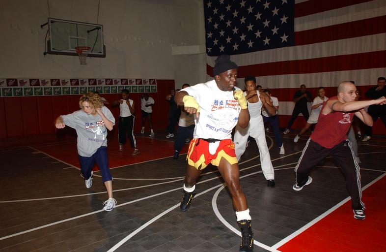 | Keywords: 020111-N-1523T-001 Fitness aboard Ship.jpg en 020111-N-1523T-001 GAETA Italy Jan 11 2002 -- Signalman Seaman Jeremy Cavaretta of New York right works out with Billy Blanks center the creator of Tae Bo during his visit aboard the Sixth Fleet flagship USS La Salle AGS 3 Blanks was onboard for a ribbon-cutting ceremony officially opening a new multi-purpose court onboard The 29 000 facility which was funded completely by non-appropriated or non-taxpayer funds is part of an ongoing effort to improve exercise facilities for Sailors serving at sea U S Navy photo by Photographer's Mate 2nd Class Todd Reeves Released 2002-01-11 020111-N-1523T-001 Navy http //www navy mil/view_image asp id 551 U S Navy photo by Photographer's Mate 2nd Class Todd Reeves PD-USGov-Military-Navy Billy Blanks Aboard USS La Salle AGF-3 Sports in the United States Navy January 2002 photographs |