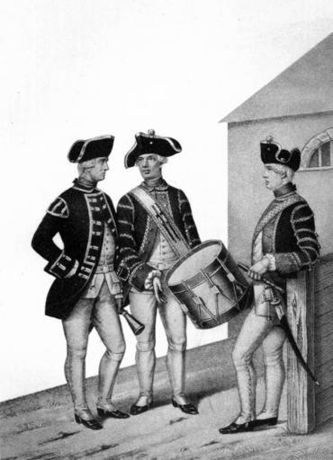 | Keywords: 03 429 Book illustrations of Historical description of the clothes and weapons of Russian troops.png ru Гобоист ба абанщик и флейтист мушкете ского Цеге-Фон- антейфеля полка 1756-1760 г en Infantry musicians of musketeers regiment 1756-1760 Military drummers Musketeers in art Drummers from Russia Seven Years' War | ||||