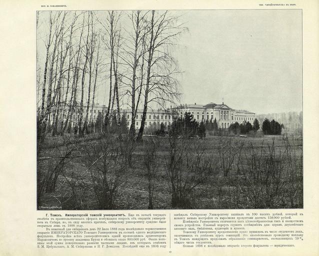 | Keywords: 040 Томск Императорский томский университет.jpg ru Альбом «Великий путь Виды Сиби и и Великой сиби ской железной до оги» 1899 en «Great Path - Views of Siberia and Great Siberian Railway» book 1899 1899 flickr photos by I R Tomaskiewicz comments by V A I-v Custom license marker 2014 04 08 PD-RusEmpire PD-old Great Path - Views of Siberia and Great Siberian Railway Uploaded with UploadWizard | ||||