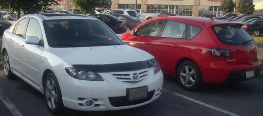 Keywords: '04-'06 Mazda3 Sedan & '07-'09 Mazda3 Hatchback.jpg 2004-2006 2007-2009 Mazda3s photographed in Kirkland Quebec Canada Red hatchbacks White Mazda sedans Mazda3 BK Own 07/08/10 Bull-Doser All Rights Released