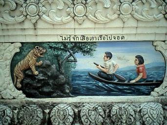 | Keywords: 0638ไม่ร้จากเสือ.JPG ไม่รู้จัก สือ อา รือไปจอด -- Illustrated Proverb Don't know there's a tiger so park the boat Phra That Phanom chedi Amphoe That Phanom Nakhon Phanom Province northeastern Thailand 2004-06-21 Pawyi Lee Public domain Reliefs in Thailand Wat Phra Tat Phanom Reliefs of tigers Rowboats in art Thai proverbs |