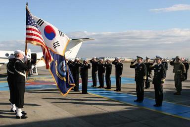Keywords: 071119-N-1113S-001.jpg Vice Adm Doug Crowder Vice Adm Ahn Kee-seok sideboys and members of U S 7th Fleet ™s Marine Fleet Anti-terrorism Security Team salute the colors on the flight line of Naval Air Facility Atsugi Japan Ahn Commander-in-Chief Republic of Korea Fleet flew into Atsugi to meet Crowder the commander of the 7th Fleet as part of a several-day visit to further relations between the U S and Korean navies http //www c7f navy mil/news/2007/november/071119-N-1113S-001 jpg U S NAVAL AIR FACILITY ATSUGI Japan Nov 19 2007 Mass Communication Specialist 2nd Class Matthew Schwarz PD-USGov-Military-Navy Color guards of the United States Navy Fleet Antiterrorism Security Team Military people with flags People of the Republic of Korea Navy People of the United States Navy Photographs of multiple national flags People with flags of the United States Salutes to flags Photographs of standing men Sailor suits William Douglas Crowder