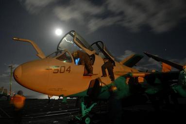 | Keywords: aircraft airplane carrier electronic warfare electronicwarfare flight deck flightdeck flt. deck fltdeck sailors pacific ocean pacificocean 080617-N-3946H-179 PACIFIC OCEAN (June 17, 2008) Sailors assigned to Electronic Attack Squadron (VAQ) 136 conduct a post-flight check on the cockpit of an EA-6B Prowler aboard the aircraft carrier USS Kitty Hawk (CV 63). Kitty Hawk is returning to the United States for decommissioning after 47 years of service. The ship will be replaced by nuclear-powered aircraft carrier USS George Washington (CVN 73). U.S. Navy photo by Mass Communication Specialist 3rd Class Patrick Heil (Released) 080617-N-3946H-179 PACIFIC OCEAN (June 17, 2008) Sailors assigned to Electronic Attack Squadron (VAQ) 136 conduct a post-flight check on the cockpit of an EA-6B Prowler aboard the aircraft carrier USS Kitty Hawk (CV 63). Kitty Hawk is returning to the United States for decommissioning after 47 years of service. The ship will be replaced by nuclear-powered aircraft carrier USS George Washington (CVN 73). U.S. Navy photo by Mass Communication Specialist 3rd Class Patrick Heil (Released) 080617-N-3946H-179
