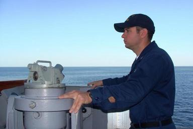 Keywords: 091225-N-XXXXX-002.jpg en U S Navy Hospital Corpsman 1st Class Francis Nicola stands watch on the bridge of guided-missile frigate USS Rentz FFG 46 under way in the North Arabian Sea conducting maritime security operations in the U S 5th Fleet area of responsibility Dec 25 2009 U S Navy photo/Released DefenseImagery mil VIRIN 091225-N-XXXXX-002 US Navy 2009-12-25 USS Rentz FFG-46 PD-USGov-Military-Navy