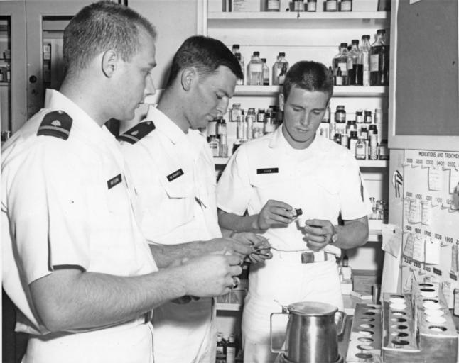 | Keywords: people blackandwhite monochrome indoor black and white A lesson in medication is taught by two Navy nurses. The nurses are Ensigns Gerald A. Florn (left) and Sterling W. Bonawits. The Corpsman-pupil is Hn [hospitalman] James E. Diskin. [Pharmacy.][Nurses. Nursing.][Training.][Medical supplies.][Scene.] Camp Lejeune, North Carolina. 09-5018-15 A lesson in medication is taught by two Navy nurses. The nurses are Ensigns Gerald A. Florn (left) and Sterling W. Bonawits. The Corpsman-pupil is Hn [hospitalman] James E. Diskin. [Pharmacy.][Nurses. Nursing.][Training.][Medical supplies.][Scene.] Camp Lejeune, North Carolina. 09-5018-15 |