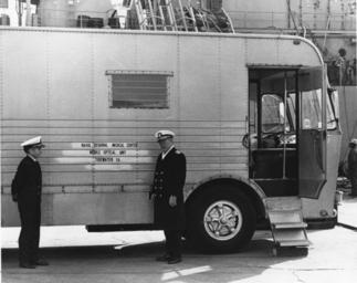 | Keywords: blackandwhite monochrome outdoor black and white Rear Admiral J.L. Yon, Medical Corps, U.S. Navy, now retired (right) and Captain W.P. Arentzen, Medical Corps, U.S. Navy (now Rear Admiral and successor to Rear Admiral Yon), left, stand before the Naval Regional Medical Center Mobile Optical van dedicated in February 1972. The van contains a screening room and 20-foot eye lane, with Titmus vision tester for screening eye chair and stand, phoropter, projector and screen, lensometer and hard instruments. The van can be stationed near a ship to accommodate personnel requiring eye examinations and can be used for dependents at more remote dispensaries without an assigned optometrist. The van will be manned by a hospital corpsman and Naval Regional Medical Center optometrists (on a rotating basis).[Automobiles.][Hospitals.][Scene.] Portsmouth, Virginia 04/1972; U.S. Navy Medicine. 09-5048-022 Rear Admiral J.L. Yon, Medical Corps, U.S. Navy, now retired (right) and Captain W.P. Arentzen, Medical Corps, U.S. Navy (now Rear Admiral and successor to Rear Admiral Yon), left, stand before the Naval Regional Medical Center Mobile Optical van dedicated in February 1972. The van contains a screening room and 20-foot eye lane, with Titmus vision tester for screening eye chair and stand, phoropter, projector and screen, lensometer and hard instruments. The van can be stationed near a ship to accommodate personnel requiring eye examinations and can be used for dependents at more remote dispensaries without an assigned optometrist. The van will be manned by a hospital corpsman and Naval Regional Medical Center optometrists (on a rotating basis).[Automobiles.][Hospitals.][Scene.] Portsmouth, Virginia 04/1972; U.S. Navy Medicine. 09-5048-022 |
