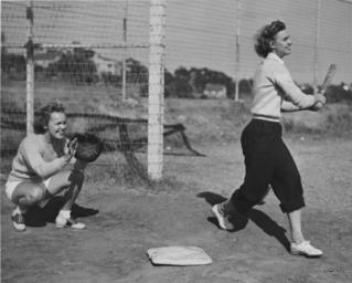| Keywords: blackandwhite monochrome outdoor black and white 09-5055-31 How Navy Nurses Keep Fit - "Keep fit to keep fighting men fit" is the motto of nurses at the U.S. Naval Hospital, San Diego, who have inaugurated a rigorous physical training program. Voluntarily participating in sports and calisthenics, the Navy nurses are preparing themselves to withstand the war-time physical demands of long hours during emergencies and of service outside the continental limits of the United states. The sports have the additional advantage of providing off-hour recreation and keeping the nurses trim. Added zest has been given the games by competition between nurses quartered at Balboa Park and those living on the hospital compound, and between nurses and WAVES. Unused grounds on the hospital reservation have been utilized in providing recreational facilities. A hilly area in front of the administration building has been covered with grass, trees and flowers and converted into a 9 hole golf course. Dorothy Wheeler, of Lincoln, Nebraska, captain of one of the Navy Nurses softball teams, slams out a long single into left field during a game at the U.S. Naval Hospital, San Diego. Grace Nilsen, of Escanaba, Michigan is the catcher. [Exercise.][Recreation.][Nurses. Nursing.][Scene.] San Diego, California Part III. Released 06/1943;File Number: MS-RE-22-42835; 948; 09-5055-31 How Navy Nurses Keep Fit - "Keep fit to keep fighting men fit" is the motto of nurses at the U.S. Naval Hospital, San Diego, who have inaugurated a rigorous physical training program. Voluntarily participating in sports and calisthenics, the Navy nurses are preparing themselves to withstand the war-time physical demands of long hours during emergencies and of service outside the continental limits of the United states. The sports have the additional advantage of providing off-hour recreation and keeping the nurses trim. Added zest has been given the games by competition between nurses quartered at Balboa Park and those living on the hospital compound, and between nurses and WAVES. Unused grounds on the hospital reservation have been utilized in providing recreational facilities. A hilly area in front of the administration building has been covered with grass, trees and flowers and converted into a 9 hole golf course. Dorothy Wheeler, of Lincoln, Nebraska, captain of one of the Navy Nurses softball teams, slams out a long single into left field during a game at the U.S. Naval Hospital, San Diego. Grace Nilsen, of Escanaba, Michigan is the catcher. [Exercise.][Recreation.][Nurses. Nursing.][Scene.] San Diego, California Part III. Released 06/1943;File Number: MS-RE-22-42835; 948; |