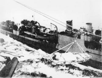 | Keywords: blackandwhite monochrome outdoor black and white 09-7912-65 Transferring a wounded Nazi submarine captain from the destroyer, which picked him up, to the baby flat-top whose Grumman Avenger torpedo bombers sank his vessel with a loss of all but 33 of his crew. This same escort carrier depth-bombed and sank 3 German subs in 4 days. [Boats.] [Litters. Transport of sick and wounded.] [World War 2. European Theater.] [Scene.] WWII (European Theater). 09-7912-65 Transferring a wounded Nazi submarine captain from the destroyer, which picked him up, to the baby flat-top whose Grumman Avenger torpedo bombers sank his vessel with a loss of all but 33 of his crew. This same escort carrier depth-bombed and sank 3 German subs in 4 days. [Boats.] [Litters. Transport of sick and wounded.] [World War 2. European Theater.] [Scene.] WWII (European Theater). |