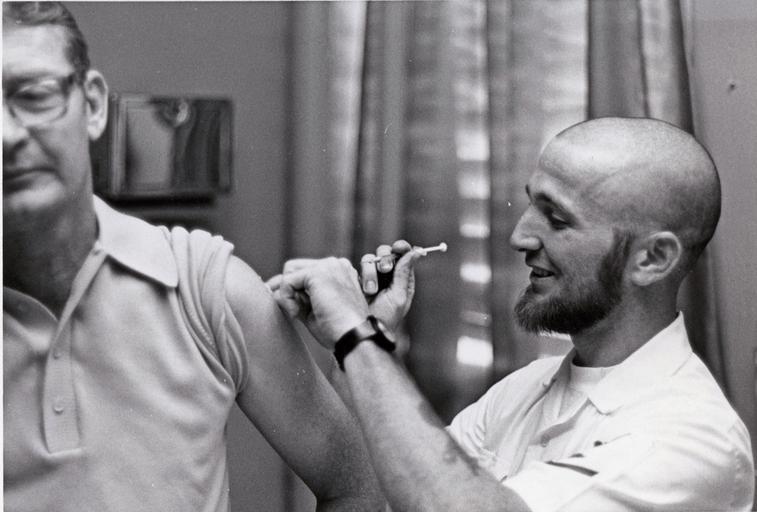 | Keywords: blackandwhite indoor black and white 09-8048-101 HM3 [Hospital Corpsman 3rd Class] John Merchant gives a patient a vaccination at the Naval Hospital Branch Clinic, U.S. Naval Base, Subic Bay, Republic of the Philippines. [Vaccinations.] [Scene.] Hospital Corpsmen - in action. 09/1976; Photo by JOC Milt Harris. 09-8048-101 HM3 [Hospital Corpsman 3rd Class] John Merchant gives a patient a vaccination at the Naval Hospital Branch Clinic, U.S. Naval Base, Subic Bay, Republic of the Philippines. [Vaccinations.] [Scene.] Hospital Corpsmen - in action. 09/1976; Photo by JOC Milt Harris. |