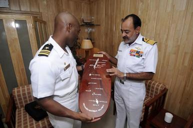 | Keywords: 100323-N-OX597-187 Indian navy Vice Adm. D. K. Joshi, right presents a wooden plaque.jpg en Indian navy Vice Adm D K Joshi right commander-in-chief of Andaman and Nicobar command presents a wooden plaque depicting the Andaman islands to U S Navy Lt Cmdr Walter Mainor commanding officer of the mine countermeasures ship USS Patriot MCM 7 during a visit to Joshi's office in Port Blair India March 23 2010 The plaque is made of local Padauk wood which was also used for a lot of the furniture in Buckingham palace is made of Padauk Patriot will be training with the Indian navy during her visit to Port Blair U S Navy photo by Mass Communication Specialist 1st Class Richard Doolin/Released Photographer's Name MC1 Richard DoolinLocation Port Blair 2010-03-23 09 02 50 http //www defenseimagery mil/imagery html a search s Joshi n 30 t 0 guid 3a166d2c866ca4ce85b14003d59d6244ab0a5d41 MC1 Richard Doolin PD-USGov-Military-Navy Uploaded with UploadWizard Admirals of India |