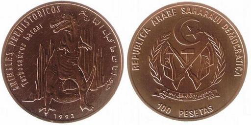 Keywords: 100pesetassaharauiscobre1993.JPG Western Sahara 100 pesetas 1993 2007-02-19 own assumed Orosaharaui~commonswiki Coins of Sahrawi Arab Democratic Republic 1993 coins 100 peseta coins 1993 Tarbosaurus Dinosaurs in art