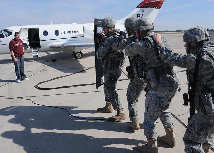 | Keywords: 101206-F-5640T-058 (5245955335).jpg From left U S Air Force Airman 1st Class Oscar Bodden roleplaying an aircraft hijacker surrenders to Staff Sgts Edmund Grant and Thomas Valenzuela and Airmen 1st Class Jessee Angulo and Adam Dunnam during a training exercise at Randolph Air Force Base Texas Dec 6 2010 The security forces Airmen are assigned to the 902nd Security Forces Squadron DoD photo by Dave Terry U S Air Force/Released https //www flickr com/photos/39955793 N07/5245955335/ 101206-F-5640T-058 2009-06-15 07 03 https //www flickr com/people/39955793 N07 U S Department of Defense Current Photos PD-USGov U S Department of Defense Current Photos https //flickr com/photos/39955793 N07/5245955335 2016-09-03 15 52 10 United States Government Work Randolph Air Force Base San Antonio Texas United States Air Force training |