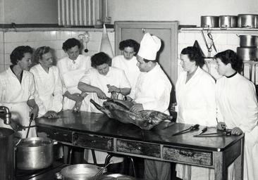 | Keywords: restaurant kitchen oppdal turisthotell oppdalturisthotell norsk spisevognselskap norskspisevognselskap kjøkken blackandwhite indoor black and white Gris til jul! Opplæring på kjøkkenet, Oppdal Turisthotell. Hotellet åpnet i 1924, og ble drevet av Norsk Spisevognselskap fram til 1973, da det ble solgt til andre eiere. I arkivet etter Norsk Spisevognselskap er det ca. 150 fotografier fra perioden 1919 - 1974. De fleste bildene som finnes er fra turisthotellene som selskapet drev, men det finnes også bilder fra togsett og restaurantvogner. Fotografiene viser ofte ansatte i arbeid og gir et godt bilde av hvordan det var å arbeide i flere av yrkene i A/S Norsk Spisevognselskap. Fotograf: Cornelius Jacobsen Arkivreferanse: Pa1528_ua2_012 Pork for Christmas! Training in the kitchen, Oppdal Tourist Hotel. The hotel opened in 1924, and was run by Norsk Spisevognselskap until 1973, when it was sold to other owners. In the archive of Norsk Spisevognselskap there are approx. 150 photographs covering the period 1919-1974. Most of them are from the tourist hotels that the company ran, but there are also photos of train sets and restaurant coaches. The photos often show employees at work and give a good impression of what it was like to work for A/S Norsk Spisevognselskap. Gris til jul! Opplæring på kjøkkenet, Oppdal Turisthotell. Hotellet åpnet i 1924, og ble drevet av Norsk Spisevognselskap fram til 1973, da det ble solgt til andre eiere. I arkivet etter Norsk Spisevognselskap er det ca. 150 fotografier fra perioden 1919 - 1974. De fleste bildene som finnes er fra turisthotellene som selskapet drev, men det finnes også bilder fra togsett og restaurantvogner. Fotografiene viser ofte ansatte i arbeid og gir et godt bilde av hvordan det var å arbeide i flere av yrkene i A/S Norsk Spisevognselskap. Fotograf: Cornelius Jacobsen Arkivreferanse: Pa1528_ua2_012 Pork for Christmas! Training in the kitchen, Oppdal Tourist Hotel. The hotel opened in 1924, and was run by Norsk Spisevognselskap until 1973, when it was sold to other owners. In the archive of Norsk Spisevognselskap there are approx. 150 photographs covering the period 1919-1974. Most of them are from the tourist hotels that the company ran, but there are also photos of train sets and restaurant coaches. The photos often show employees at work and give a good impression of what it was like to work for A/S Norsk Spisevognselskap. |