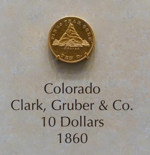 | Keywords: 10 Dollars, Clark, Gruber & Co., Colorado, 1860 - National Museum of American History - DSC00222.jpg en Exhibit in the National Museum of American History Washington DC USA Photography was permitted in the museum without restriction 2015-03-27 11 32 20 own Daderot other versions cc-zero Coins of the Pike's Peak Gold Rush in the National Museum of American History | ||||