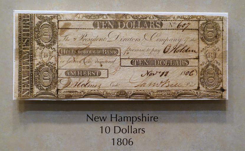 | Keywords: 10 Dollars, New Hampshire, 1806 - National Museum of American History - DSC00204.jpg en Exhibit in the National Museum of American History Washington DC USA Photography was permitted in the museum without restriction 2015-03-27 11 30 17 own Daderot other versions cc-zero Banknotes in the National Museum of American History Local currencies of the United States | ||||