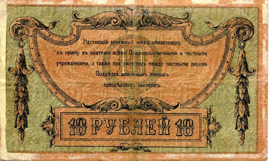 | Keywords: 10 Roubles cossacks 1918.jpg en Russian Don banknote 10 rubles 1918 year ru Банкнота Донской области достоинством 10 ублей об азца 1918 года scanned note from own personal collection П авительство Донской области/Ростовская конто а Госбанка 1918 1918 currency Banknotes of Don 1918 Banknotes with a face value of 10 1918 in Russia |