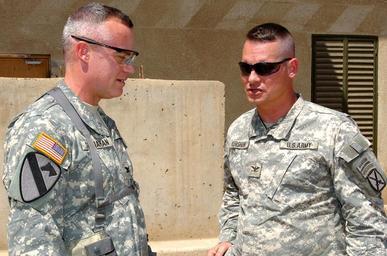 | Keywords: 10th Mountain Brigade Recognizes 1st Air Cavalry's Support DVIDS53709.jpg en Col Dan Shanahan left Traverse City Mich native and commander of the 1st Air Cavalry Brigade 1st Cavalry Division visits with Huffman Texas native Col Mike Kershaw right commander of the 2nd Brigade Combat Team 10th Mountain Division outside the 1st ACB headquarters at Camp Taji Iraq Kershaw presented some plaques commemorating the relationship between the two units as well as a captured enemy DSHKA anti-aircraft weapons system 2007-08-13 Staff Sgt Nathan Hoskins https //www dvidshub net/image/53709 53709 2007-08-14 09 04 TAJI IQ PD-USGov 1st Cavalry Division United States Camp Taji Images from DoD uploaded by Fæ |