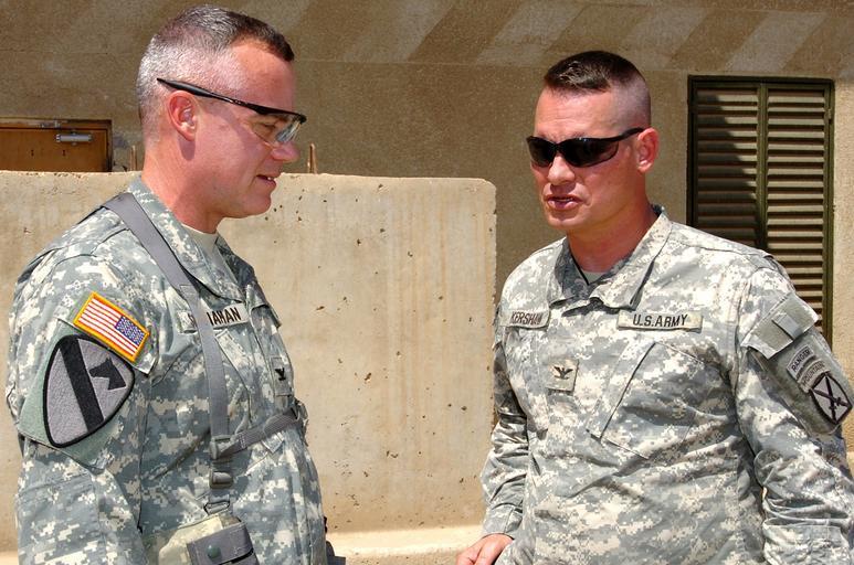 Keywords: 10th Mountain Brigade Recognizes 1st Air Cavalry's Support DVIDS53709.jpg en Col Dan Shanahan left Traverse City Mich native and commander of the 1st Air Cavalry Brigade 1st Cavalry Division visits with Huffman Texas native Col Mike Kershaw right commander of the 2nd Brigade Combat Team 10th Mountain Division outside the 1st ACB headquarters at Camp Taji Iraq Kershaw presented some plaques commemorating the relationship between the two units as well as a captured enemy DSHKA anti-aircraft weapons system 2007-08-13 Staff Sgt Nathan Hoskins https //www dvidshub net/image/53709 53709 2007-08-14 09 04 TAJI IQ PD-USGov 1st Cavalry Division United States Camp Taji Images from DoD uploaded by Fæ |