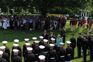 | Keywords: white house whitehouse president chancellor obama merkel germany ceremonial navy band navyband navy ceremonial band navyceremonialband people crowd sport outdoor 110607-N-HG258-125 WASHINGTON, D.C. (June 7, 2011) Capt. Brian Walden conducts the U.S. Navy Ceremonial Band as President Barack Obama and Chancellor Angela Merkel inspect the troops during the arrival ceremony welcoming the chancellor of the Federal Republic of Germany, Angela Merkel. Military arrival ceremonies for visiting dignitaries have been held on the south lawn of the White House since the Kennedy administration. (U.S. Navy Photo by MUC Stephen Hassay/Released) 110607-N-HG258-125 WASHINGTON, D.C. (June 7, 2011) Capt. Brian Walden conducts the U.S. Navy Ceremonial Band as President Barack Obama and Chancellor Angela Merkel inspect the troops during the arrival ceremony welcoming the chancellor of the Federal Republic of Germany, Angela Merkel. Military arrival ceremonies for visiting dignitaries have been held on the south lawn of the White House since the Kennedy administration. (U.S. Navy Photo by MUC Stephen Hassay/Released) |