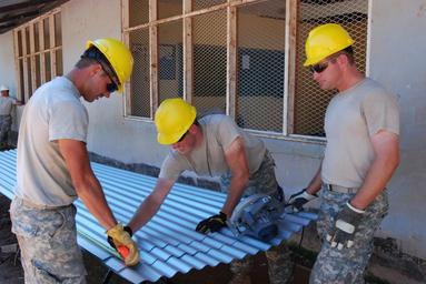 | Keywords: 110725-A-PH759-324 (5988128162).jpg From left U S Army Spc Weston Blasius Spc Waylon Blasius and Sgt Kirk Surat measure and cut steel roofing material at the Pater van der Pluym School in Paramaribo Suriname July 25 2011 The Soldiers were participating in New Horizons Suriname a U S Southern Command-directed joint humanitarian and civic assistance mission deploying U S military engineers veterinarians medics and other professions to Suriname for training construction projects and to provide humanitarian and medical services DoD photo by Spc Manda Walters U S Army/Released https //www flickr com/photos/39955793 N07/5988128162/ 110725-A-PH759-324 2011-07-25 11 53 https //www flickr com/people/39955793 N07 U S Department of Defense Current Photos PD-USGov U S Department of Defense Current Photos https //flickr com/photos/39955793 N07/5988128162 2016-09-03 13 52 00 United States Government Work New Horizons 2011 Paramaribo South Dakota South Dakota Army National Guard Suriname United States Department of Defense |