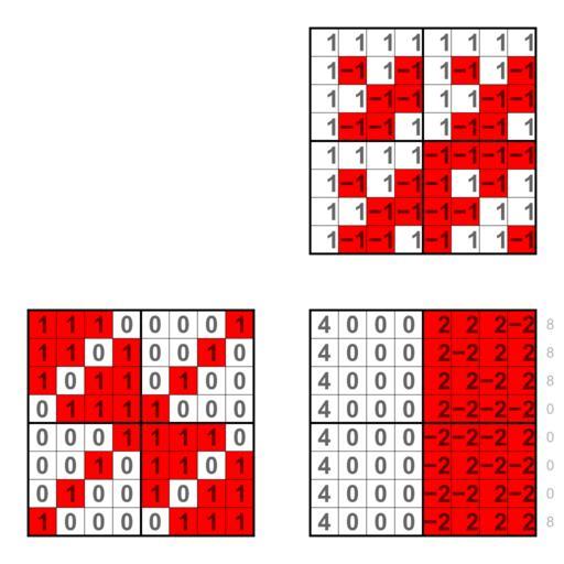 | Keywords: 1110 0001 Walsh spectrum.svg Walsh spectra of 3-ary Boolean functions like 1110 0001 The binary strings are multiplied with a Walsh matrix of order 8 The red squares in the background are additional information and show the product of the binary strings with a binary Walsh matrix own Lipedia Walsh spectrum of 3-ary Boolean functions |