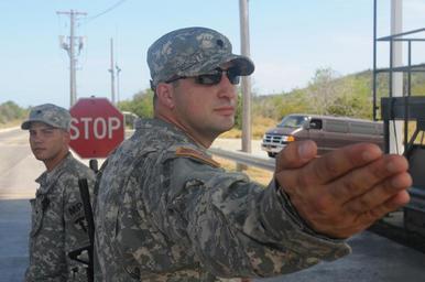 | Keywords: 115th MP Company Guard Checkpoint DVIDS280541.jpg en Army Spc Constantinos Dafoulas left and Army Spc Douglas Pina with the Rhode Island Army National Guard s 115th Military Police Company man a checkpoint at Joint Task Force Guantanamo May 17 2010 The 115th Military Police Company is on a year-long deployment providing security at JTF Guantanamo 2010-05-17 Petty Officer 3rd Class Joshua Nistas https //www dvidshub net/image/280541 100517-N-+++++-028 2010-05-19 14 26 GUANTANAMO BAY CU PD-USGov-Military-Navy Joint Task Force Guantanamo Images from DoD uploaded by Fæ |