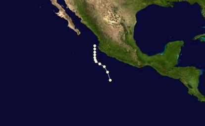 | Keywords: 11-E 1957 track.png Track map of Hurricane Eleven of the 1957 Pacific hurricane season The points show the location of the storm at 6-hour intervals The colour represents the storm's maximum sustained wind speeds as classified in the Saffir-Simpson Hurricane Scale see below and the shape of the data points represent the nature of the storm according to the legend below User Nilfanion/Tc/T Created by Cyclonebiskit using Wikipedia WikiProject Tropical cyclones/Tracks The background image is from NASA Tracking data switch source from the National Hurricane Center <sup>http //www nhc noaa gov/pastall shtml</sup> from the Central Pacific Hurricane Center <sup>http //www prh noaa gov/cphc/summaries/</sup> from the Joint Typhoon Warning Center <sup>https //metocph nmci navy mil/jtwc/best_tracks/</sup> from the Japan Meteorological Agency <sup>http //www jma go jp/jma/jma-eng/jma-center/rsmc-hp-pub-eg/besttrack html</sup> from the National Hurricane Center <sup>http //www nhc noaa gov/pastall shtml and the Central Pacific Hurricane Center http //www prh noaa gov/cphc/summaries/</sup> from the Central Pacific Hurricane Center <sup>http //www prh noaa gov/cphc/summaries/ and the Joint Typhoon Warning Center https //metocph nmci navy mil/jtwc/best_tracks/</sup> from the w National Hurricane Center <sup>http //www nhc noaa gov/pastall shtml</sup> or the Joint Typhoon Warning Center <sup>https //metocph nmci navy mil/jtwc/best_tracks/</sup> 2010-01-10 Cyclonebiskit Tropical cyclone tracks Pacific hurricane tracks |