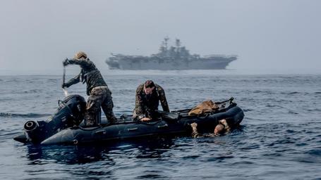 | Keywords: helocasting recon maritime raid force maritimeraidforce marine medium tiltrotor squadron 163 marinemediumtiltrotorsquadron163 seahawk crrc makin island makinisland ace caving ladder cavingladder navy 11th marine expeditionary unit 11thmarineexpeditionaryunit ladder water ch-53e ch53e mh-60 mh60 combat rubber raiding craft combatrubberraidingcraft meu ch-53e super stallion ch53esuperstallion marines reconnissance jump mrf super stallion superstallion 11th meu 11thmeu vmm-163 vmm163 outdoor AT SEA, Indian Ocean (November 28, 2016) Marines with the Maritime Raid Force get into a Combat Rubber Raiding Craft after jumping into the ocean from a CH-53E Super Stallion during a helocast training evolution near the USS Makin Island (LHD 8) afloat in the Indian Ocean, Nov. 28, 2016. Using a CRRC allows reconnaissance teams to quickly and quietly insert onto a beachhead. The Marines are with the 11th Marine Expeditionary Unit. (U.S. Marine Corps photo by Lance Cpl. Brandon Maldonado/Released) AT SEA, Indian Ocean (November 28, 2016) Marines with the Maritime Raid Force get into a Combat Rubber Raiding Craft after jumping into the ocean from a CH-53E Super Stallion during a helocast training evolution near the USS Makin Island (LHD 8) afloat in the Indian Ocean, Nov. 28, 2016. Using a CRRC allows reconnaissance teams to quickly and quietly insert onto a beachhead. The Marines are with the 11th Marine Expeditionary Unit. (U.S. Marine Corps photo by Lance Cpl. Brandon Maldonado/Released) |