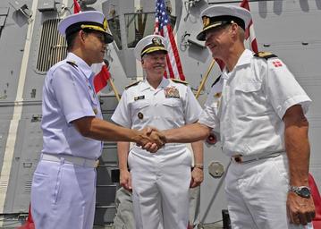 | Keywords: 1200329-N-AZ513 Rear Adm. Tanin Likitawong, left, relieves Royal Danish Navy Commodore Aage Buur Jensen.jpg MUSCAT Oman March 29 2012 Royal Thai Navy Rear Adm Tanin Likitawong left relieves Royal Danish Navy Commodore Aage Buur Jensen right of command during a change of command ceremony for Combined Task Force CTF 151 as U S Navy Vice Adm Mark Fox commander of Combined Maritime Forces looks on Established in January 2009 CTF 151 was set up to deter disrupt and suppress piracy protecting maritime vessels of any nationality international trade and securing freedom of navigation for the benefit of all U S Navy photo by Mass Communication Specialist 3rd Class John Callahan/Released 2012-03-29 12 18 Mass Communication Specialist 3rd Class John Callahan https //www flickr com/photos/compacflt/6882070116/ PD-USGov-Military-Navy 1200329-N-AZ513 MUSCAT Oman PD-USGov-Military-Navy Admirals of Denmark Admirals of Thailand Mark I Fox Combined Task Force 151 |