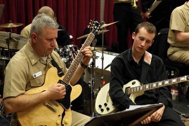 | Keywords: commodores us navy band brass instrument music concert band 120223-N-HG258-015 February 23, 2012 (WASHINGTON D.C.) A member of the Herndon High School jazz band observes Chief Musician Gary Malvaso play guitar with the Commodores jazz ensemble during their trip to the Commodores' rehearsal spaces at the Washington Navy Yard. The Navy Band "Music in the Schools" program, designed to bring concerts and demonstrations to school aged children, introduces students to live music performances by professional Navy musicians. (U.S. Navy Photo by MUC Stephen Hassay /Released) 120223-N-HG258-015 February 23, 2012 (WASHINGTON D.C.) A member of the Herndon High School jazz band observes Chief Musician Gary Malvaso play guitar with the Commodores jazz ensemble during their trip to the Commodores' rehearsal spaces at the Washington Navy Yard. The Navy Band "Music in the Schools" program, designed to bring concerts and demonstrations to school aged children, introduces students to live music performances by professional Navy musicians. (U.S. Navy Photo by MUC Stephen Hassay /Released) |