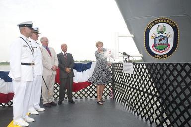 | Keywords: somerset avondale louisiana huntington industries incoporated huntingtonindustriesincoporated ingalls shipbuilding ingallsshipbuilding christening la. la united states unitedstates 120728-N-ZZ999-001 AVONDALE, La. (July 28, 2012) Mrs. Mary Jo Myers (right) breaks a bottle of sparkling wine across the bow of the Ingalls-built amphibious transport dock LPD 25, officially christening the ship Somerset. Also pictured (left to right) are Master Chief Larry Lynch, prospective command master chief, LPD 25; Lt. Cmdr. John Moore, prospective executive officer, LPD 25; Patrick White, president, Families of Flight 93, and keynote speaker; and Irwin F. Edenzon, president, Ingalls Shipbuilding. (Photo courtesy of Huntington Industries Inc./Released) 120728-N-ZZ999-001 AVONDALE, La. (July 28, 2012) Mrs. Mary Jo Myers (right) breaks a bottle of sparkling wine across the bow of the Ingalls-built amphibious transport dock LPD 25, officially christening the ship Somerset. Also pictured (left to right) are Master Chief Larry Lynch, prospective command master chief, LPD 25; Lt. Cmdr. John Moore, prospective executive officer, LPD 25; Patrick White, president, Families of Flight 93, and keynote speaker; and Irwin F. Edenzon, president, Ingalls Shipbuilding. (Photo courtesy of Huntington Industries Inc./Released) |