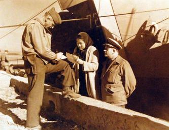 | Keywords: 127-GW-1541-139697: Japanese Surrender, August-September 1945. Kagoshima, Kyushu, December 1945. Checking the guard requirements for the afternoon Tokyo repatriation train with Japanese interpreter, American-born Irene Nagane, is Military Police Officer, First Lieutenant Carrell D. Rowe. Photographed by T.E. McNally. U.S. Marine Corps Photograph, now in the collections of the National Archives. (2016/05/03). 127-GW-1541-139697: Japanese Surrender, August-September 1945. Kagoshima, Kyushu, December 1945. Checking the guard requirements for the afternoon Tokyo repatriation train with Japanese interpreter, American-born Irene Nagane, is Military Police Officer, First Lieutenant Carrell D. Rowe. Photographed by T.E. McNally. U.S. Marine Corps Photograph, now in the collections of the National Archives. (2016/05/03). |