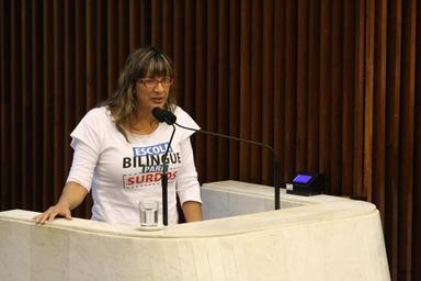 | Keywords: sessão plenária sessãoplenária sueli fernandes suelifernandes indoor Professora Sueli Fernandes, da Federação Nacional de Educação e Integração dos Surdos (Feneis/PR), em pronunciamento na sessão plenária desta segunda-feira (12/09). De acordo com a professora, o que se vê, na escola proposta pelo MEC, é a inserção de crianças surdas, em geral, sem contato prévio com nenhuma língua, nem português nem Libras, em salas onde o meio de instrução é o português. O evento atendeu a uma proposição do deputado Professor Lemos (PT), que considera fundamental o debate, especialmente para que a população adquira consciência e respeite a pessoa surda. Foto: Nani Gois/Alep (crédito obrigatório) Professora Sueli Fernandes, da Federação Nacional de Educação e Integração dos Surdos (Feneis/PR), em pronunciamento na sessão plenária desta segunda-feira (12/09). De acordo com a professora, o que se vê, na escola proposta pelo MEC, é a inserção de crianças surdas, em geral, sem contato prévio com nenhuma língua, nem português nem Libras, em salas onde o meio de instrução é o português. O evento atendeu a uma proposição do deputado Professor Lemos (PT), que considera fundamental o debate, especialmente para que a população adquira consciência e respeite a pessoa surda. Foto: Nani Gois/Alep (crédito obrigatório) |