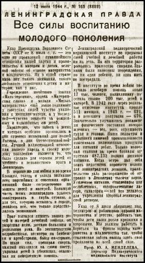 Keywords: Ленингадская Правда 12 июля 1944.jpg ru Вы езка из газеты Ленингадская П авда за июдь 1944 года со статьёй Ю А енделевой собственный а хив неизвестен; вы езка из газеты 1944 Saint Petersburg Pediatric Academy PD-Art