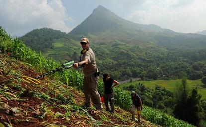 | Keywords: chieng dong village chiengdongvillage son la sonla vietnam vnm outdoor SON LA, Socialist Republic of Vietnam (Oct. 31, 2011) - Air Force Staff Sgt. Marc Rowand-Donohue, an explosive ordnance disposal technician assigned to the Joint POW/MIA Accounting Command, scans an area for metal while Megan Ingvoldstad and Jennifer Byrnes, both Fellows from the Forensic Science Academy, scan the soil surface and wait to mark any hits with pin flags. Five recovery teams are searching in the Thai Nguyen, Bac Giang, Lang Son, Son La, and Thanh Hoa provinces at aircraft crash and burial sites for six Americans. The ultimate goal of the Joint POW/MIA Accounting Command, and of the agencies involved in returning America’s heroes home, is to achieve the fullest possible accounting of Americans lost during the nation’s past conflicts. (DoD photo by Mr. Jason Kaye, U.S. Navy/Released) SON LA, Socialist Republic of Vietnam (Oct. 31, 2011) - Air Force Staff Sgt. Marc Rowand-Donohue, an explosive ordnance disposal technician assigned to the Joint POW/MIA Accounting Command, scans an area for metal while Megan Ingvoldstad and Jennifer Byrnes, both Fellows from the Forensic Science Academy, scan the soil surface and wait to mark any hits with pin flags. Five recovery teams are searching in the Thai Nguyen, Bac Giang, Lang Son, Son La, and Thanh Hoa provinces at aircraft crash and burial sites for six Americans. The ultimate goal of the Joint POW/MIA Accounting Command, and of the agencies involved in returning America’s heroes home, is to achieve the fullest possible accounting of Americans lost during the nation’s past conflicts. (DoD photo by Mr. Jason Kaye, U.S. Navy/Released) |