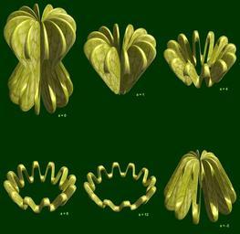 | Keywords: mathematica 3d cg parametricplot3d texture torus 輪環 りんかん ドーナツ どーなつ 十二芒星 じゅうにぼうせい 十二光星 じゅうにこうせい 十二稜星 じゅうにりょうせい code program algorithm コード プログラム アルゴリズム geometric sculpture geometricsculpture shape geometry sculpture mapping テクスチャ マッピング 模様 もよう abstract 抽象 ちゅうしょう アブストラクト design pattern デザイン パターン graphic グラフィック グラフィクス structure 意匠 構造 symmetry 対称性 たいしょうせい シンメトリー 対称 たいしょう algorithm コード organic pattern blossom plant black background outdoor a = 12; (* center hole size of a torus *) b = 12; (* 12-angle-torus *) c = 0; (* distance from the center of rotation *) d = 1; (* number of torus *) h = 2; (* height of a torus *) SetOptions[ParametricPlot3D, PlotRange -> Full, Mesh -> None, Boxed -> False, Axes -> False, PlotPoints -> 400, ImageSize -> 1000, Background -> Darker[Green, 0.8], PlotStyle -> Directive[Specularity[White, 30], Texture[Import["D:/tmp/71.jpg"]]], TextureCoordinateFunction -> ({#4, #5 b Pi} &), Lighting -> "Neutral"]; f[v_] := Sin[2 Sin[Sin[Sin[v]]]]; x = (a - Cos[t] - f[b s]) Cos[s + Pi/b]; y = (a - Cos[t] - f[b s]) Sin[s + Pi/b]; z = (a - Sin[t] - h f[b s]) + c; rm = Table[{x, y, z}.RotationMatrix[2 i Pi/d, {1, 0, 0}], {i, d}]; ParametricPlot3D[rm, {t, 0, 2 Pi}, {s, 0, 2 Pi}] (*--- The Texture *) a = 12; (* center hole size of a torus *) b = 12; (* 12-angle-torus *) c = 0; (* distance from the center of rotation *) d = 1; (* number of torus *) h = 2; (* height of a torus *) SetOptions[ParametricPlot3D, PlotRange -> Full, Mesh -> None, Boxed -> False, Axes -> False, PlotPoints -> 400, ImageSize -> 1000, Background -> Darker[Green, 0.8], PlotStyle -> Directive[Specularity[White, 30], Texture[Import["D:/tmp/71.jpg"]]], TextureCoordinateFunction -> ({#4, #5 b Pi} &), Lighting -> "Neutral"]; f[v_] := Sin[2 Sin[Sin[Sin[v]]]]; x = (a - Cos[t] - f[b s]) Cos[s + Pi/b]; y = (a - Cos[t] - f[b s]) Sin[s + Pi/b]; z = (a - Sin[t] - h f[b s]) + c; rm = Table[{x, y, z}.RotationMatrix[2 i Pi/d, {1, 0, 0}], {i, d}]; ParametricPlot3D[rm, {t, 0, 2 Pi}, {s, 0, 2 Pi}] (*--- The Texture *) |