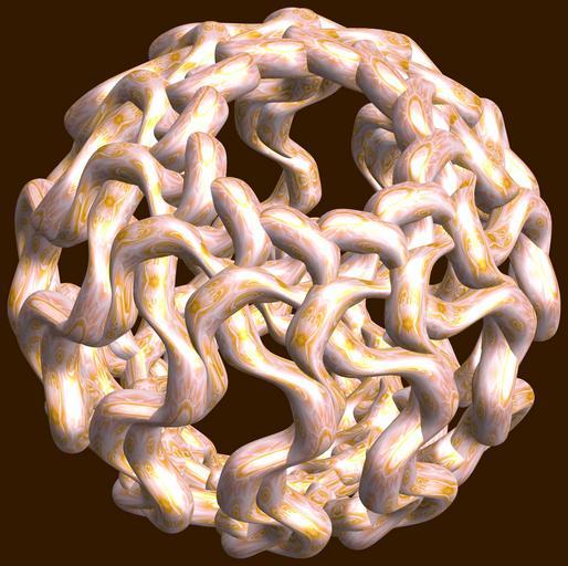 | Keywords: mathematica 3d cg parametricplot3d texture torus 輪環 りんかん ドーナツ どーなつ 八芒星 はちぼうせい 八光星 はちこうせい 八稜星 はちりょうせい code program algorithm コード プログラム アルゴリズム geometric sculpture geometricsculpture shape geometry sculpture mapping テクスチャ マッピング 模様 もよう abstract 抽象 ちゅうしょう アブストラクト design pattern デザイン パターン graphic グラフィック グラフィクス structure 意匠 構造 symmetry 対称性 たいしょうせい シンメトリー 対称 たいしょう algorithm コード black background indoor food a = 12; (* center hole size of a torus *) b = 8; (* octa-torus *) c = -18; (* distance from the center of rotation *) d = 12; (* number of torus *) h = 1; (* height of a torus *) SetOptions[ParametricPlot3D, PlotRange -> Full, Mesh -> None, Boxed -> False, Axes -> False, PlotPoints -> 400, ImageSize -> 3000, Background -> Darker[Orange, 0.8], PlotStyle -> Directive[Specularity[White, 30], Texture[Import["D:/tmp/861.jpg"]]], TextureCoordinateFunction -> ({#4, #5 2 Pi} &), Lighting -> "Neutral"]; f[v_] := Sin[2 Sin[Sin[Sin[v]]]]; x = (a - Cos[t] - f[b s]) Cos[s + Pi/b]; y = (a - Cos[t] - f[b s]) Sin[s + Pi/b]; z = (a - Sin[t] - h f[b s]) + c; rm = Table[{x, y, z}.RotationMatrix[2 i Pi/d, {1, 1, 0}], {i, d}]; ParametricPlot3D[rm, {t, 0, 2 Pi}, {s, 0, 2 Pi}] (*--- The Texture *) a = 12; (* center hole size of a torus *) b = 8; (* octa-torus *) c = -18; (* distance from the center of rotation *) d = 12; (* number of torus *) h = 1; (* height of a torus *) SetOptions[ParametricPlot3D, PlotRange -> Full, Mesh -> None, Boxed -> False, Axes -> False, PlotPoints -> 400, ImageSize -> 3000, Background -> Darker[Orange, 0.8], PlotStyle -> Directive[Specularity[White, 30], Texture[Import["D:/tmp/861.jpg"]]], TextureCoordinateFunction -> ({#4, #5 2 Pi} &), Lighting -> "Neutral"]; f[v_] := Sin[2 Sin[Sin[Sin[v]]]]; x = (a - Cos[t] - f[b s]) Cos[s + Pi/b]; y = (a - Cos[t] - f[b s]) Sin[s + Pi/b]; z = (a - Sin[t] - h f[b s]) + c; rm = Table[{x, y, z}.RotationMatrix[2 i Pi/d, {1, 1, 0}], {i, d}]; ParametricPlot3D[rm, {t, 0, 2 Pi}, {s, 0, 2 Pi}] (*--- The Texture *) |