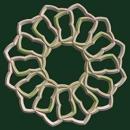 | Keywords: mathematica 3d cg parametricplot3d texture torus code program algorithm プログラム コード アルゴリズム 輪環 りんかん ドーナツ どーなつ 五芒星 ごぼうせい geometric sculpture geometricsculpture shape geometry sculpture mapping テクスチャ マッピング 模様 もよう abstract 抽象 ちゅうしょう アブストラクト design pattern デザイン パターン graphic グラフィック グラフィクス structure 意匠 構造 symmetry 対称性 たいしょうせい シンメトリー 対称 たいしょう tangle organic pattern black background a = 8; (* center hole size *) b = 5; (* penta-torus *) c = 12; (* distance from the center of rotation *) d = 12; (* number of torus *) h = 0; (* height of a torus *) SetOptions[ParametricPlot3D, PlotRange -> Full, Mesh -> None, Boxed -> False, Axes -> False, PlotPoints -> 400, ImageSize -> 3000, Background -> RGBColor[{20, 50, 30}/255], PlotStyle -> Directive[Specularity[White, 70], Texture[Import["D:/tmp/862.jpg"]]], TextureCoordinateFunction -> ({#4 + #5, #5 / Pi} &), Lighting -> "Neutral"]; f[v_] := TriangleWave[{-1, 1}, v/(2 Pi)]; g[v_] := TriangleWave[{-1, 1}, v/(2 Pi) + 1/4]; x = (a - g[t] - f[b s]) Cos[s] + c; y = (a - g[t] - f[b s]) Sin[s] + c; z = (a - f[t] - h f[b s]); rm = Table[{x, y, z}.RotationMatrix[2 i Pi/d, {0, 0, 1}], {i, d}]; ParametricPlot3D[rm, {t, 0, 2 Pi}, {s, 0, Pi}] (*--- The Texture *) a = 8; (* center hole size *) b = 5; (* penta-torus *) c = 12; (* distance from the center of rotation *) d = 12; (* number of torus *) h = 0; (* height of a torus *) SetOptions[ParametricPlot3D, PlotRange -> Full, Mesh -> None, Boxed -> False, Axes -> False, PlotPoints -> 400, ImageSize -> 3000, Background -> RGBColor[{20, 50, 30}/255], PlotStyle -> Directive[Specularity[White, 70], Texture[Import["D:/tmp/862.jpg"]]], TextureCoordinateFunction -> ({#4 + #5, #5 / Pi} &), Lighting -> "Neutral"]; f[v_] := TriangleWave[{-1, 1}, v/(2 Pi)]; g[v_] := TriangleWave[{-1, 1}, v/(2 Pi) + 1/4]; x = (a - g[t] - f[b s]) Cos[s] + c; y = (a - g[t] - f[b s]) Sin[s] + c; z = (a - f[t] - h f[b s]); rm = Table[{x, y, z}.RotationMatrix[2 i Pi/d, {0, 0, 1}], {i, d}]; ParametricPlot3D[rm, {t, 0, 2 Pi}, {s, 0, Pi}] (*--- The Texture *) |