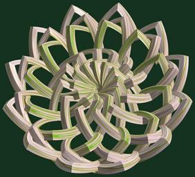 | Keywords: mathematica 3d cg parametricplot3d texture torus code program algorithm プログラム コード アルゴリズム 輪環 りんかん ドーナツ どーなつ 五芒星 ごぼうせい geometric sculpture geometricsculpture shape geometry sculpture mapping テクスチャ マッピング 模様 もよう abstract 抽象 ちゅうしょう アブストラクト design pattern デザイン パターン graphic グラフィック グラフィクス structure 意匠 構造 symmetry 対称性 たいしょうせい シンメトリー 対称 たいしょう wheel tangle black background a = 8; (* center hole size *) b = 5; (* penta-torus *) c = 6; (* distance from the center of rotation *) d = 12; (* number of torus *) h = 3; (* height of a torus *) SetOptions[ParametricPlot3D, PlotRange -> Full, Mesh -> None, Boxed -> False, Axes -> False, PlotPoints -> 400, ImageSize -> 3000, Background -> RGBColor[{20, 50, 30}/255], PlotStyle -> Directive[Specularity[White, 50], Texture[Import["D:/tmp/862.jpg"]]], TextureCoordinateFunction -> ({#4 + #5, #5 / Pi} &), Lighting -> "Neutral"]; f[v_] := TriangleWave[{-1, 1}, v/(2 Pi)]; g[v_] := TriangleWave[{-1, 1}, v/(2 Pi) + 1/4]; x = (a - g[t] - f[b s]) Cos[s] + c; y = (a - g[t] - f[b s]) Sin[s] + c; z = (a - f[t] - h f[b s]); rm = Table[{x, y, z}.RotationMatrix[2 i Pi/d, {0, 0, 1}], {i, d}]; ParametricPlot3D[rm, {t, 0, 2 Pi}, {s, 0, Pi}] (*--- The Texture *) a = 8; (* center hole size *) b = 5; (* penta-torus *) c = 6; (* distance from the center of rotation *) d = 12; (* number of torus *) h = 3; (* height of a torus *) SetOptions[ParametricPlot3D, PlotRange -> Full, Mesh -> None, Boxed -> False, Axes -> False, PlotPoints -> 400, ImageSize -> 3000, Background -> RGBColor[{20, 50, 30}/255], PlotStyle -> Directive[Specularity[White, 50], Texture[Import["D:/tmp/862.jpg"]]], TextureCoordinateFunction -> ({#4 + #5, #5 / Pi} &), Lighting -> "Neutral"]; f[v_] := TriangleWave[{-1, 1}, v/(2 Pi)]; g[v_] := TriangleWave[{-1, 1}, v/(2 Pi) + 1/4]; x = (a - g[t] - f[b s]) Cos[s] + c; y = (a - g[t] - f[b s]) Sin[s] + c; z = (a - f[t] - h f[b s]); rm = Table[{x, y, z}.RotationMatrix[2 i Pi/d, {0, 0, 1}], {i, d}]; ParametricPlot3D[rm, {t, 0, 2 Pi}, {s, 0, Pi}] (*--- The Texture *) |