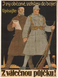 | Keywords: 12 Sammlung Eybl (Slg.Nr. 1284) I vy občané - 1917, A. Erhardt.jpg Österreich-Ungarn A Erhardt I vy občané Auch ihr Bürger auf in den Kampf Zeichnet 7 Kriegsanleihe 1917 123 x 90 cm Slg Nr 1284 Die Aufforderung Kriegsanleihe zu zeichnen wandte sich an die Bürger im Hinterland deren Söhne oft als Soldaten an der Front standen In solchen Fällen sollten die Eltern schon zu deren Unterstützung Geld zur Verfügung stellen Hier steht der Vater in gleich entschlossener Pose hinter dem uniformierten Sohn Wenn der Alte auch körperlich nicht mehr in der Lage ist mit dem Sohn in den Krieg zu ziehen so kann er ihn doch durch Zeichnung von Kriegsanleihe die er schon in der Hand hält unterstützen Die Blicke von Vater und Sohn sind nahezu ident bereit jeder auf seine Art für den Sieg zu kämpfen Die verschiedenen Ortschaften im Hintergrund symbolisieren die Spannweite der österreichischen Bevölkerung von mitteleuropäischen Dörfern bis zu mediterranen Siedlungen Alle sind Teil einer großen Familie dem Kaiserreich Österreich-Ungarn Österreich-Ungarn A Erhardt I vy občané You too citizens on to the fight Draw 7th War Loan 123 x 90 cm 1917 Slg Nr 1284 The invitation to subscribe for war bonds turned to the citizens in the back lands whose sons were often at the front as soldiers In such cases parents should make money available for support Here the father is in the same resolute pose behind the uniformed son When the old man is no longer physically able to move with the son in the war so he can support by subscribing war bonds that he holds in his hand The eyes of father and son are almost identical ready to fight everyone on his way to the victory The various localities in the background symbolize the span of the Austrian population - of Central European villages to Mediterranean settlements All are part of a large family - the Empire of Austria-Hungary Sammlung Eybl Plakatmuseum Wien 2009-07-30 16 20 01 A Erhardt Credit line Eybl Plakatmuseum Wien/Wikimedia Commons CC-BY-SA-4 0 wiki Sammlung Eybl Plakatmuseum Wien PD-old-100-1923 World War I posters of Austria-Hungary War bonds Plakatmuseum Wien Eybl Collection Quality images by Hubertl QualityImage |