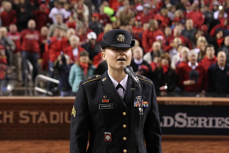 | Keywords: 131027-A-WN220-601 (10595292763).jpg U S Army Sgt Christine Permenter assigned to the 399th Army Band sings God Bless America Oct 27 2013 during the seventh inning stretch of the fourth game of the 2013 Major League Baseball World Series at Busch Stadium in St Louis DoD photo by Michael Curtis U S Army/Released https //www flickr com/photos/39955793 N07/10595292763/ 131027-A-WN220-601 2013-10-27 21 42 https //www flickr com/people/39955793 N07 U S Department of Defense Current Photos PD-USGov U S Department of Defense Current Photos https //flickr com/photos/39955793 N07/10595292763 2016-09-03 07 54 06 United States Government Work Military in Missouri United States Department of Defense |