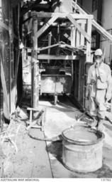 | Keywords: 131762 FILLING HOOD AT "C" STORAGE, AT THE FORMER TOKYO 2ND ARMY ARSENAL.JPG en OKUNOSHIMA JAPAN FILLING HOOD AT C STORAGE AT THE FORMER TOKYO 2ND ARMY ARSENAL NOTE THE GAS CONTAINER ON A SMALL TROLLEY READY FOR FILLING WHEN HOOD IS IN USE DOORS ARE CLOSED AND AIR EXHAUST SYSTEM PUT INTO OPERATION TO DRAW OFF POISONOUS FUMES IN DRUM IN FOREGROUND IS BLEACH SLURRY HYPERCLORITE - 50/50 BY WEIGHT WITH SEA WATER USED FOR THE DECONTAMINATION OF WORKMEN'S RUBBER CLOTHING AND FILLED CONTAINERS THIS IS PART OF OPERATION LEWISITE TO REMOVE AND DESTROY POISON GAS MAINLY MUSTARD AND LEWISITE FROM THE TOKYO 2ND ARMY ARSENAL 131762 Queale Alan 1946-08-30 Copyright expired - public domain PD-AustraliaGov Chemical weapons in Okunoshima 1946-1947 |