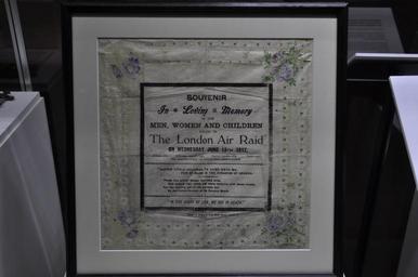 | Keywords: 13 Jun 1917 Air Raid Souvenir.JPG Pictures from RAF Museum Hendon Souvenir of a Zeppelin raid on London 13 June 1917 on display at RAF Museum Hendon London Printed on tissue paper with watercolour design this souvenir commemorates an attack by German Gotha bombers on the East End of London Text Souvenir In Loving Memory of the Men Women and Children killed in the London Air Raid on Wednesday June 13th 1917 Killed - 104 Seriously injured - 154 Slightly injured - 269 Total-527 The casualties include 120 children either killed or injured -- Suffer little children to come unto me for of such is the Kingdom of Heaven -- These tiny school babes our little ones Had ceased their tasks and were listening with bated breath For the blotting out of the glorious dun by the broken thunder of the German Death -- In the midst of life we are death Printer S Burgess 8 York Place Strand London W Original - Displayed at RAF Museum London 2014 Photo - Own work 2014-07-17 18 14 06 Author not stated probably the printer S Burgess of York Place Photo User The Land Pd-old 1917 in London Souvenirs RAF Museum London |