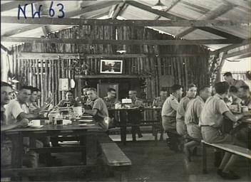 | Keywords: 13 Squadron RAAF officer's mess Hughes NT Feb 1943 AWM NWA0061.jpg AWM caption Hughes NT February 1943 Interior of the Officer's Mess of No 13 Hudson Squadron RAAF Here the Officers are at table waiting for their meal to be served to them Note the bush sapling construction of the end wall NWA0061 1943-02 not stated Copyright expired - public domain PD-Australia Hughes Airfield Northern Territory No 13 Squadron RAAF Lockheed Hudson aircrew World War II people of the Royal Australian Air Force World War II forces of Australia in Australia Military life in World War II |