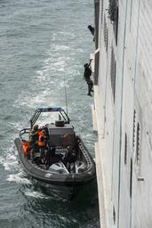| Keywords: 140419-N-AP176-020 (14003674573).jpg U S Sailors assigned to Naval Special Warfare Group 10 and Cameroonian service members conduct a simulated boarding of the joint high speed vessel USNS Spearhead JHSV 1 during Obangame Express 2014 in the Gulf of Guinea April 19 2014 Obangame Express is a maritime exercise conducted by U S Naval Forces Africa to improve cooperation among African partner nations in order to increase safety and security in the Gulf of Guinea DoD photo by Mass Communication Specialist 2nd Class Jeff Atherton U S Navy /Released https //www flickr com/photos/39955793 N07/14003674573/ 140419-N-AP176-020 2014-04-23 11 07 https //www flickr com/people/39955793 N07 U S Department of Defense Current Photos PD-USGov U S Department of Defense Current Photos https //flickr com/photos/39955793 N07/14003674573 2016-09-03 07 13 54 United States Government Work Gulf of Guinea Sailors United States Department of Defense |