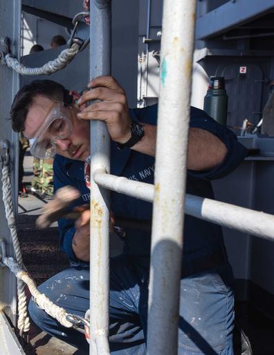 | Keywords: mcsn kenneth rodriguez santiago mcsnkennethrodriguezsantiago 150501-N-TC437-014 PACIFIC OCEAN (May 1, 2015) - Seaman Jake Walthall, from Columbia, Mo., scrapes paint off a guard rail on the fantail of USS John C. Stennis (CVN 74). The ships comprising the John C. Stennis Strike Group (JCSSG) are participating in a Group Sail exercise designed to develop coordinated capabilities. (U.S. Navy Photo by Mass Communication Specialist Seaman Kenneth Rodriguez Santiago / Released) 150501-N-TC437-014 PACIFIC OCEAN (May 1, 2015) - Seaman Jake Walthall, from Columbia, Mo., scrapes paint off a guard rail on the fantail of USS John C. Stennis (CVN 74). The ships comprising the John C. Stennis Strike Group (JCSSG) are participating in a Group Sail exercise designed to develop coordinated capabilities. (U.S. Navy Photo by Mass Communication Specialist Seaman Kenneth Rodriguez Santiago / Released) |